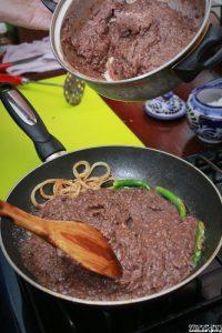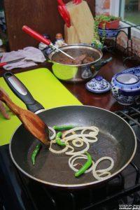 - Heat oil in a frying pan. Fry the green chilli and onion for approximately 3 minutes. Add the beans paste. Over medium heat fry the paste for 3 to 5 minutes stirring consistently. Then add the beans and cook until heated through.