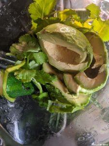 - Add the lime juice, coriander, veggie stock, olive oil, avocado and salt. Blend until you have achieved a smooth consistency.